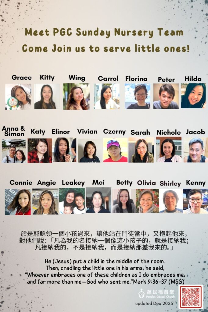 Our nursery ministry opens for babies from birth to 2.5 years old every Sunday at 2 repeated times in Room 309 to support both English worship parents & Cantonese worship parents.