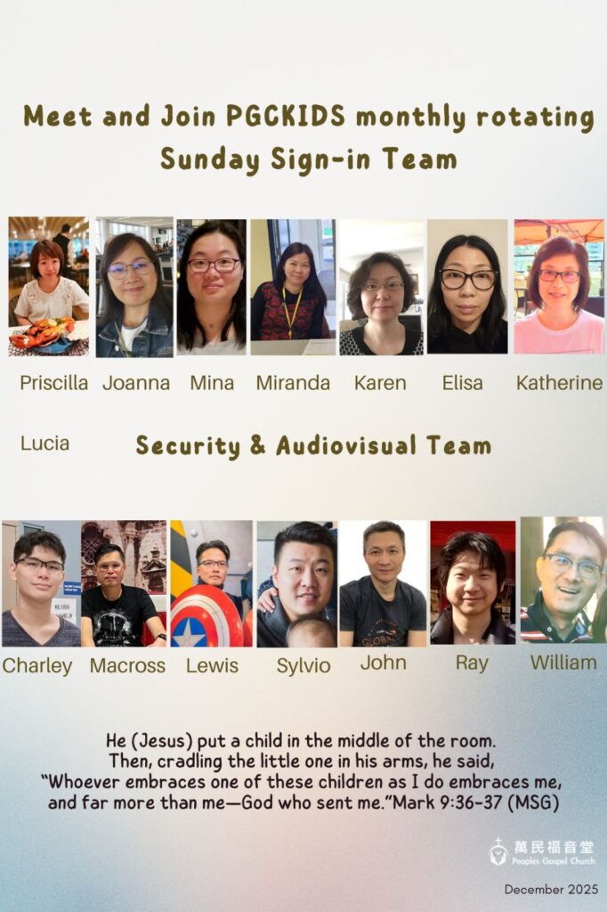 Parents! Join our teams to serve and worship to glorify Jesus and love people! Email Pastor Connie (pgckids@gmail.com)