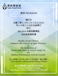 PGC cordially invite for your presence at the Ordination Service for Pastor Iain Davis and Pastor Andy Tse 10:30am on 2/15 (Sunday). Welcome you to come and witness the ordination service. Praise to the Lord! Light refreshments will be served at 9:45-10:25, and there will be PGCKIDS and Nursery Service (11:30-12:30) that Sunday.