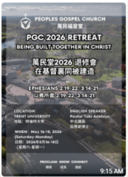 PGC church-wide retreat will take place during the Victoria Day long weekend on May 16-18, 2026 (Sat-Mon) at Trent University (Peterborough). Rev Peter Au (區應毓牧師/博士) and Pastor Tobi Adetayo (from Grace Fellowship Church) will be the guest speakers. Welcome you to join this meaningful retreat.